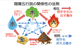 一方、相剋は木は土を抑え、土は水を抑え、水は火を抑える…というように、